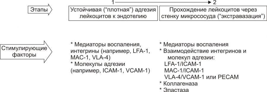 В стадии адгезии и выхода лейкоцитов выделяют 2 этапа: устойчивой («плотной») адгезии (1) и прохождения лейкоцитов через стенку микрососуда (2).