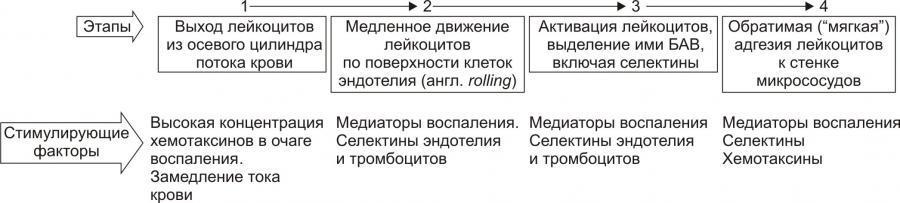 Стадии процесса эмиграции лейкоцитов в очаге воспаления: