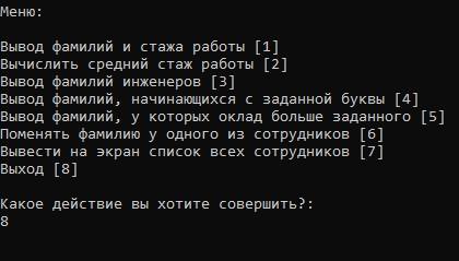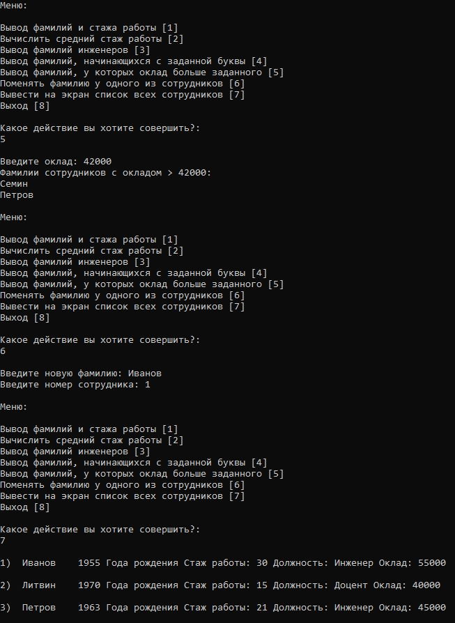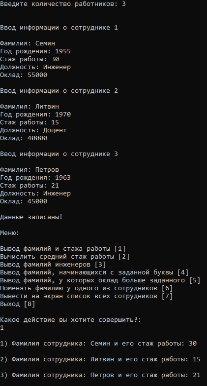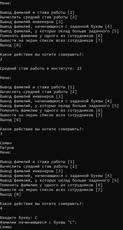 cout << "Средний стаж работы в институте: " << avg_exp / n << endl << endl;;