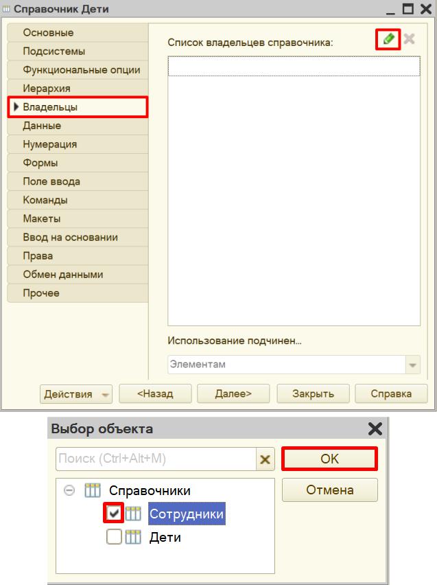 Справочник «Дети» будет подчинен справочнику «Сотрудники». Для настройки подчинения необходимо перейти на вкладку «Владельцы» и из списка справочников выбрать справочник «Сотрудники».
