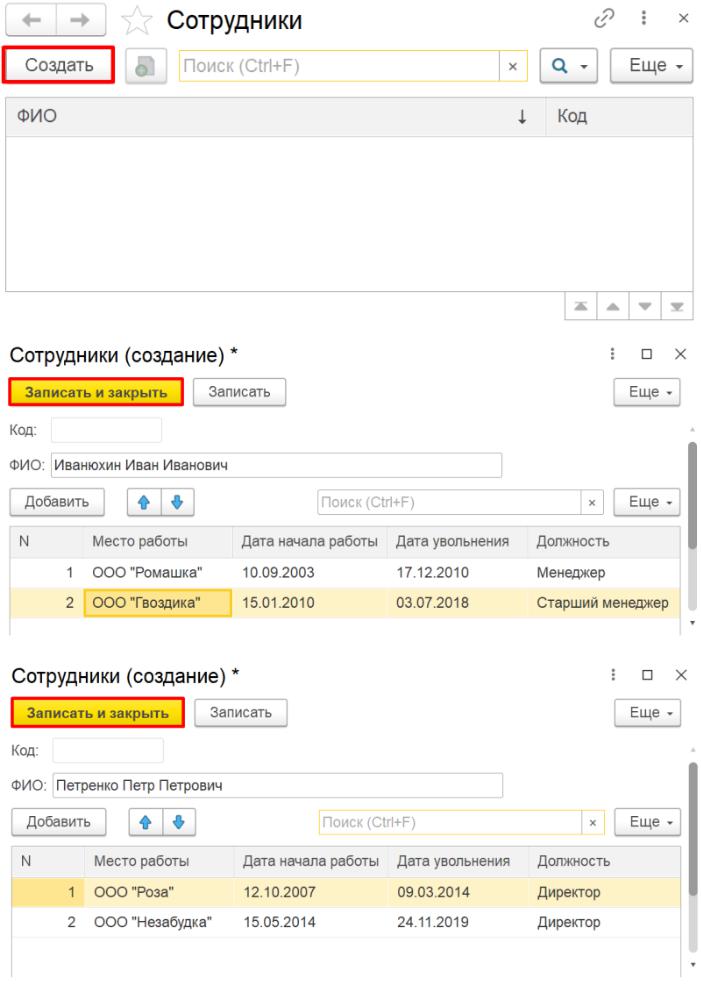 Откроем справочник «Сотрудники» в режиме «1С:Предприятие» и заполним данные о двух сотрудниках.