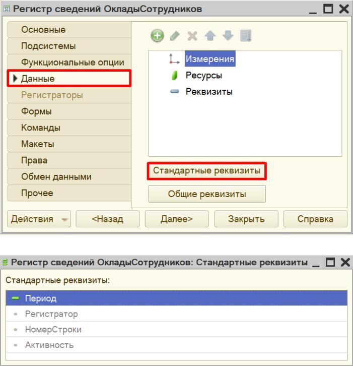 Изменив периодичность регистра на «В пределах месяца», мы активировали стандартный реквизит «Период». В него будет заноситься дата внесения данных в регистр. Это сделано для того, чтобы система могла отслеживать попытки внесения данных чаще, чем один раз в месяц.