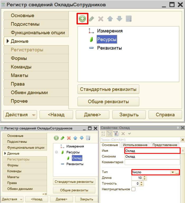 Заполнение данного окна всегда проще всего начинать с добавления ресурса. Чтобы понять, что использовать в качестве ресурса, необходимо задать вопрос: «Что мы хотим хранить в данном регистре?». Мы хотим хранить данные об окладах. Следовательно, оклад и будет являться ресурсом. Тип данного реквизита – «Число».