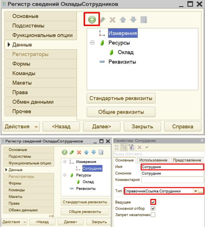 Чтобы разобраться с измерением, нужно понять, в разрезе чего мы хотим хранить оклад? Мы хотим хранить оклад (чей?) сотрудников. Значит, в качестве измерения необходимо добавить реквизит «Сотрудник». Тип данного реквизита – «СправочникСсылка.Сотрудники». В этом поле будут храниться ссылки на элементы справочника «Сотрудники».