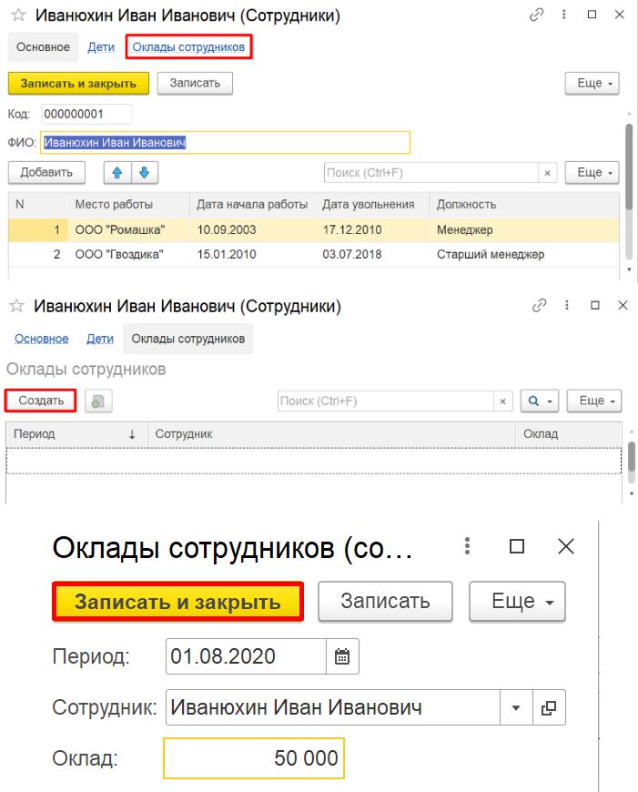 Добавим оклад сотруднику прямиком из карточки сотрудника.