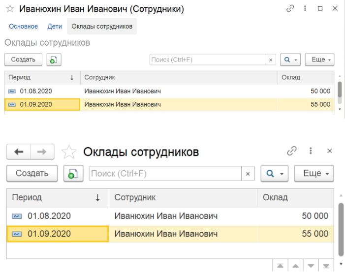 Откроем регистр сведений в режиме «1С:Предприятие» и введем данные об окладе сотрудника за несколько месяцев.