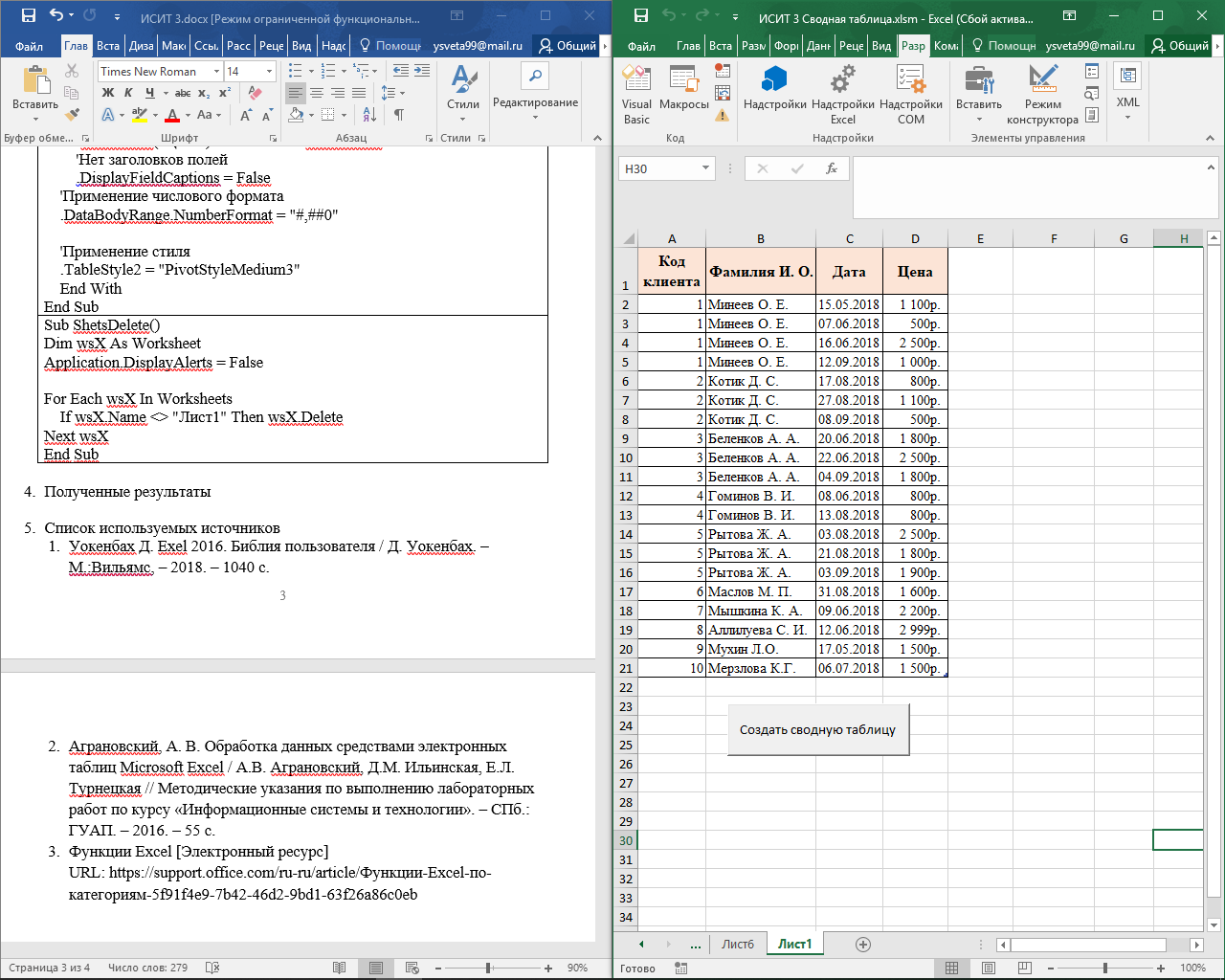 Первым этапом выполнения процедуры является удаление всех листов книги, кроме «Лист1» на котором находиться исходная таблица с данными (рисунок 2). Далее создаётся новый лист «Сводная таблица» на нём создаётся сводная таблица по заранее заданным в коде параметрам. Результат работы программы представлен на рисунке 3.