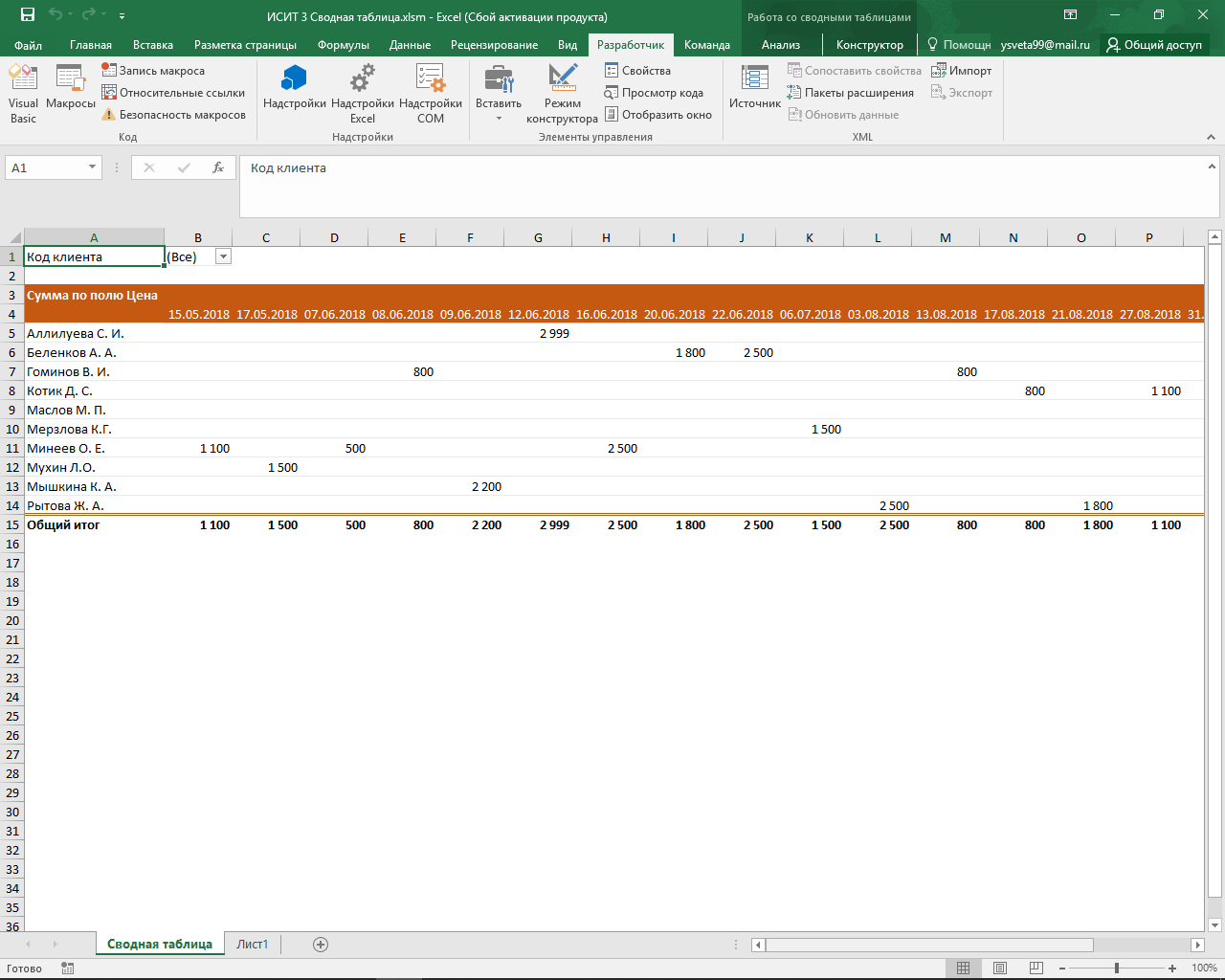 'Создание кеша Set PTcache = ActiveWorkbook.PivotCaches.Create( _ SourceType:=xlDatabase, _ SourceData:=Range("A1").CurrentRegion) 'Добавление нового листа в сводную таблицу Worksheets.Add ActiveSheet.Name = "Сводная таблица" ActiveWindow.DisplayGridlines = False 'Создание сводной таблицы Set pt = ActiveSheet.PivotTables.Add( _ PivotCache:=PTcache, _ TableDestination:=Range("A3")) 'Добавление полей With pt .PivotFields("Код клиента").Orientation = xlPageField .PivotFields("Фамилия И. О.").Orientation = xlRowField .PivotFields("Дата").Orientation = xlColumnField '.PivotFields("Дата").Group Periods:=Array(False, False, False, False, True, False, False)