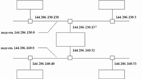 На рисунке 1 изображен фрагмент сети класса B - 144.206.0.0, состоящий из двух подсетей - 144.206.130.0 и 144.206.160.0. В центре схемы изображена машина шлюз, которая связывает подсети. Эта машина имеет два сетевых интерфейса и, соответственно, два IP-адреса.
