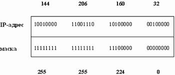 Маска подсети - это четыре байта, которые накладываются на IP-адрес для получения номера подсети. Например, маска 255.255.255.0 позволяет разбить сеть класса В на 254 подсети по 254 узла в каждой. На рисунке 2 приведено маскирование подсети 144.206.160.0 из предыдущего примера.
