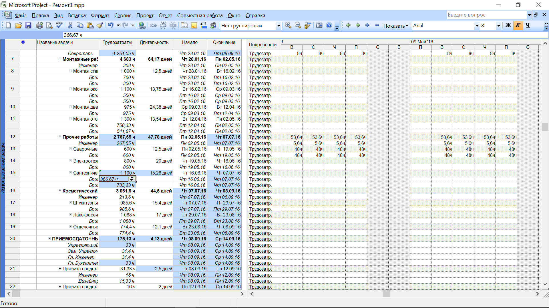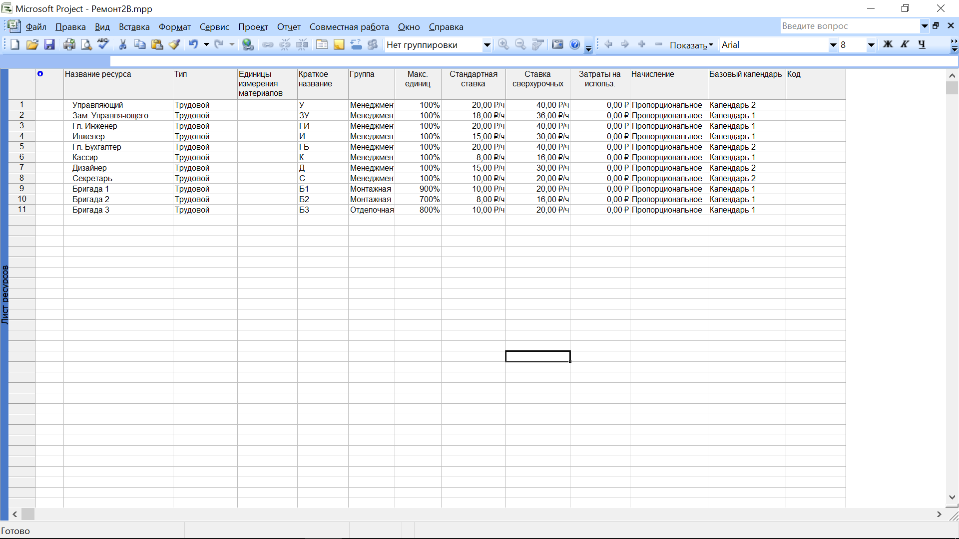 Отредактирован формат встроенной в Microsoft Project таблицы Затраты, результат показан на рисунке 2.