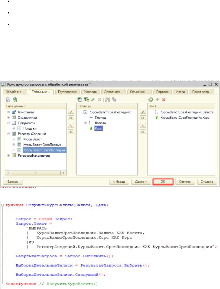 Данные будем брать не из регистра сведений напрямую, а из виртуальной таблицы, которую создает этот регистр автоматически. Данная виртуальная таблица позволит получить последние введенные значения по каждой валюте.