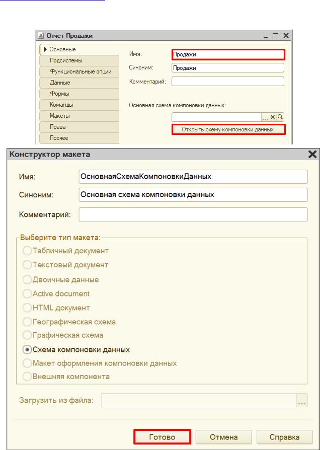 Добавим отчет «Продажи». Воспользуемся схемой компоновки данных.