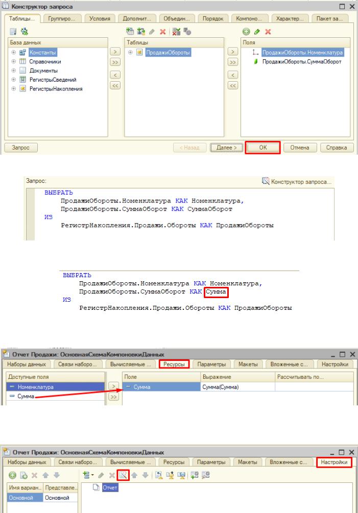 Для красоты зададим синоним полю «СуммаОборот». Сделать это можно с помощью конструктора запроса либо прямо в окне запроса.