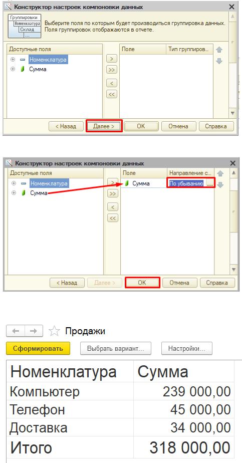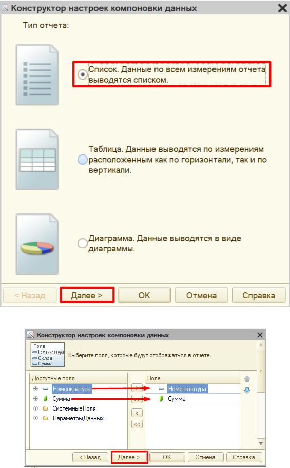 Далее мы реализуем итоговый подсчет всех сумм для нашего отчета, указав поле «Сумма» в качестве ресурса на соответствующей вкладке.