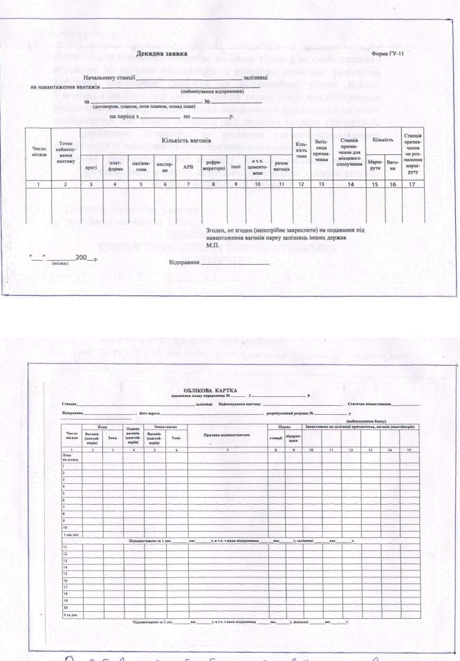 Вантажовідправники зобов'язані за 2 дні до початку кожної декади поточного місяця, не рахуючи дня подачі, надати начальнику станції декадну заявку форми ГУ-11 (рис.3.4) із розподілом подачі вагонів на кожний день. Як правило, на декаду повинна приходитись третина місячного плану. Якщо маршрути не плануються, вагони в заявці повинні розподілятися протягом декади ритмічно, близько середньодобової кількості вагонів на кожний день.