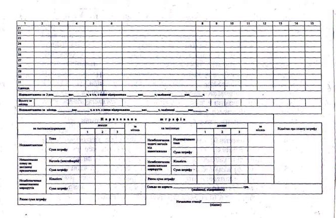•кількість вагонів (контейнерів), не завантажених із вини відправника, визначається як різниця між підсумками граф 5 і 4, до цієї різниці додається кількість вагонів (контейнерів), не поданих залізницею під навантаження з вини відправника; та віднімається кількість не завантажених вагонів із причин стихійного лиха, обмежень перевезень та інших надзвичайних обставин, які звільняють відправника від відповідальності за недовантаження;