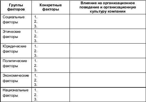 В табл.1 приведены основные группы факторов международной среды, влияющих на организационное поведение и организационную культуру компаний. Приведите примеры конкретных факторов в каждой группе и определите, какое влияние они оказывают (на что влияют и каким образом).