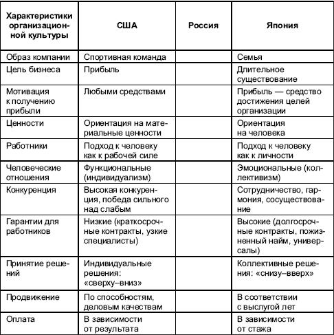 Таблица 2. Организационная культура компаний США, Японии и России