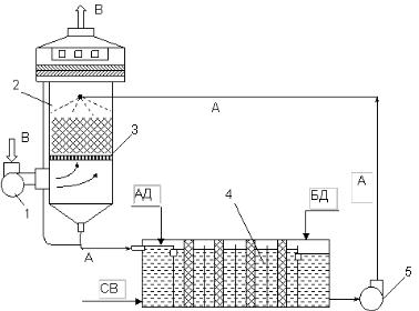 1 – вентилятор; 2 – абсорбер (скруббер); 3 – массообменная решетка; 4 – биореактор; 5 – насос; А – абсорбент; В– вентиляционный воздух; АД – абсорбционные добавки; БД – биогенные добавки; СВ – сжатый воздух.