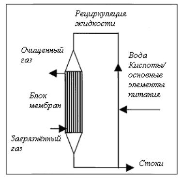 Богатая питанием жидкая среда инокулируется микроорганизмами, способными разрушать токсиканты. Органические соединения так же как кислород переносятся из газовой фазы к мембране. После прохождения через неѐ, соединения разлагаются микроорганизмами, которые либо иммобилизованы на мембране, либо присутствуют в массе жидкости. Жидкая фаза поддерживается в резервуаре, куда постоянно доставляются кислород и питательные элементы, поддерживаются постоянные температура и рН. Мембраны могут быть как гидрофобными, так и гидрофильными.