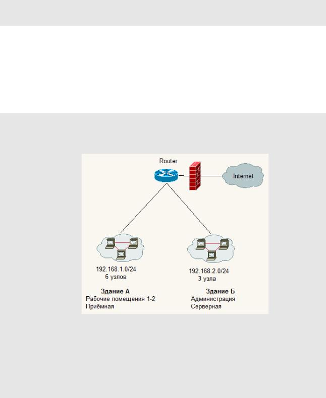 Сеть включает в себя две подсети, доступ к Интернет осуществляется при помощи маршрутизатора Router, он же выполняет функции межсетевого экрана.