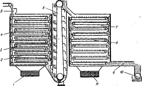 с виброситом; 10 — барабан-выколачиватель; 11 — калорифер бункера сушки