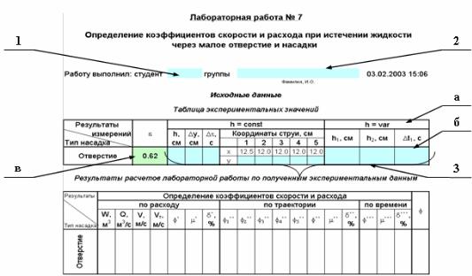 Работа выполняется следующим образом. Студентом заполняются данные о себе (рис. 1, поз. 1, 2). Затем заполняются рабочие ячейки таблицы экспериментальных данных (рис. 1, поз. 3). После ввода данных необходимо перевести курсор из последней заполненной ячейки в любую другую (путем нажатия клавиши [Enter] или клавиш со стрелками, или перевести «мышью» курсор на другое поле и активизировать его).