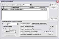 Помимо оценки эффективности вложения в проект в целом в Project Expert успешно решается так называемая «задача инвестора». Вы определяете, удовлетворяют ли финансовые результаты участия в проекте требованиям всех заинтересованных в нем сторон - владельцев предприятия, инвесторов, кредиторов и госструктур, анализируя рассчитанные системой основные финансовые показатели и показатели эффективности инвестиций.