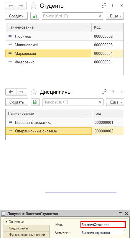 Добавим новый документ «ЗанятияСтудентов».