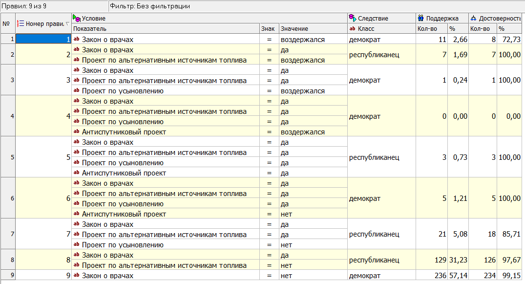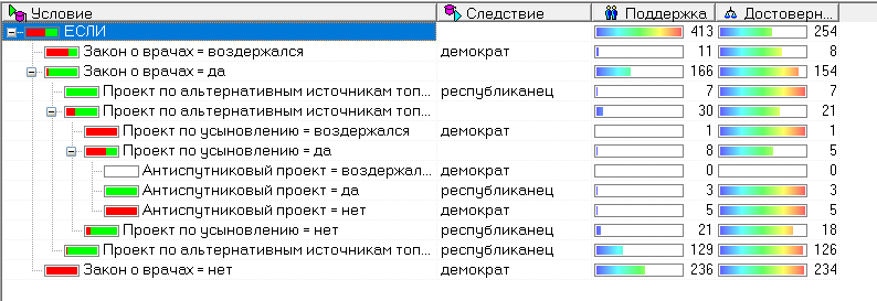 Вывод: в результате проверки эффективности дерева было выявлено 6 из 15 закономерностей. Так же были выявлены 4 значимых атрибута. Большинство найденных закономерностей содержит в себе значимые атрибуты.
