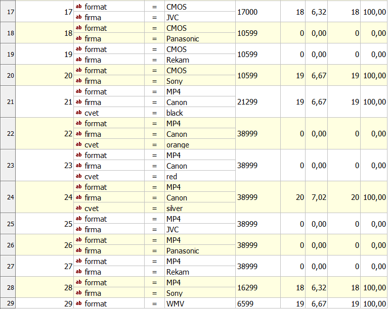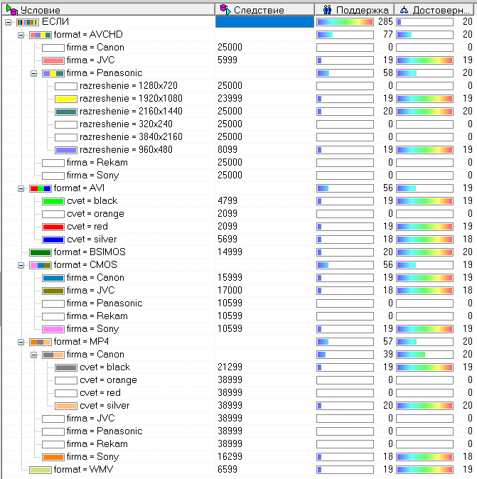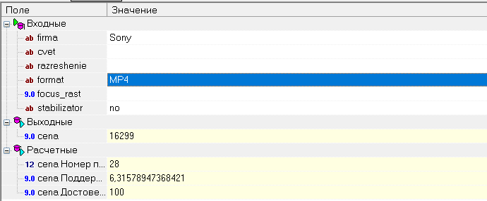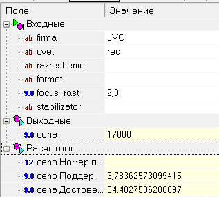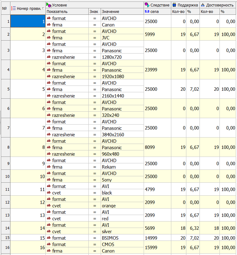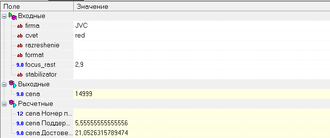 Если фирма = JVC И цвет = красный И фокусное расстояние = 2.9, ТО цена = 17000