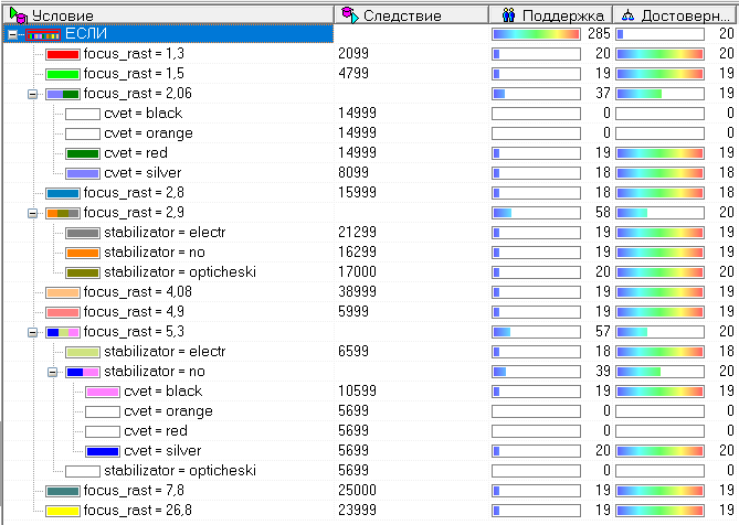 Вывод: в результате проверки эффективности дерева было выявлено 8 из 15 закономерностей. Дерево решений было изменено, главным значимым атрибутом стало фокусное расстояние. Во многих закономерностях присутствует этот атрибут из – за этого увеличилось количество выявленных закономерностей.