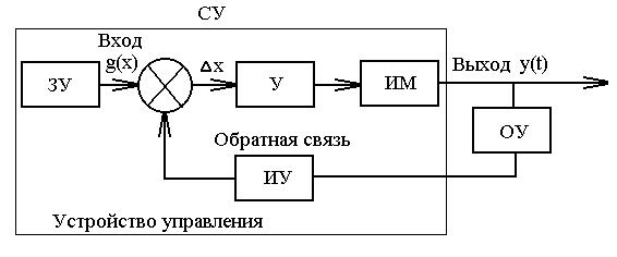 В общем случае САУ состоит (рис. 2) из объекта управления ОУ, измерительного устройства ИУ, задающего устройства ЗУ, суммирующего устройства СУ, усилителя У и исполнительного механизма ИМ.