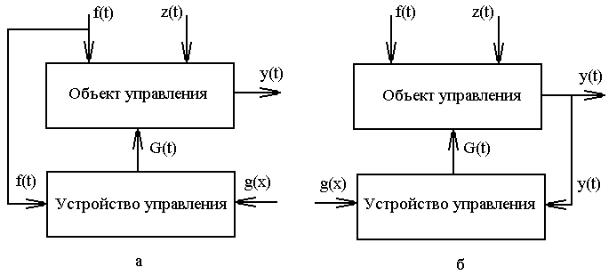 Управление по возмущению (рис.3 а) основано на принципе компенсации возмущений (разомкнутое управление) и является исторически первым принципом автоматического управления. Управляемый параметр не изменяется, а используется информация о внешнем воздействии f(t). При этом сначала выясняют, какое возмущающее воздействие является основным, а затем устанавливают, как необходимо менять значение управляемого параметра при изменении данного возмущающего воздействия, для того чтобы значение его поддерживать постоянным. Достоинство – имеется возможность полной компенсации возмущения. Недостаток – в случае преобладания неконтролируемых возмущения z(f) этот способ не дает требуемой точности.
