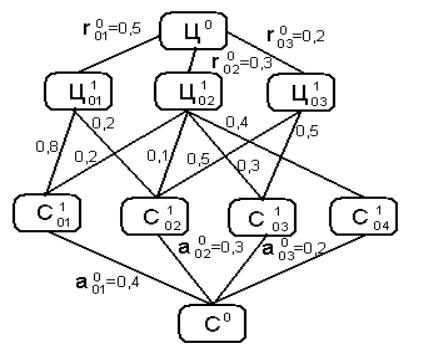 Рис. 6 Схема взаимодействия дерева целей (ДЦ) и дерева систем (ДС): Ц о – цель высшего уровня; Ц 101…03 – цели первого уровня; С° – система высшего уровня; С 101…04 – системы первого уровня