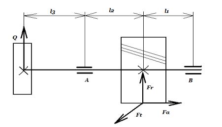 Задание 1. Выписать исходные данные для расчета быстроходного вала редуктора из табл. 6.1 согласно варианта: n1, об/мин – частота вращения шестерни; m, мм – модуль зацепления; z1 – число зубьев шестерни; Р, кВт – передаваемая мощность; α – угол зацепления, α = 20°; β, град – угол наклона зубьев; l1, l2, l3, мм – длины участков между центрами деталей на валу; Qр, Н
