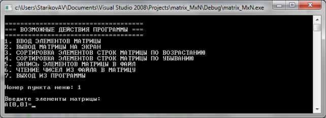 Работа программы осуществляется в консольном режиме. Для реализации возможностей, реализованных в программе, пользователь использует простое текстовое меню. Выбор требуемого пункта меню осуществляется вводом соответствующего номера. Например, для ввода значений элементов массива используется номер пункта меню 1, который обеспечивает вызов функции inp_matrix (рисунок 2). Ввод значения для каждого элемента матрицы завершается нажатием клавиши Enter.