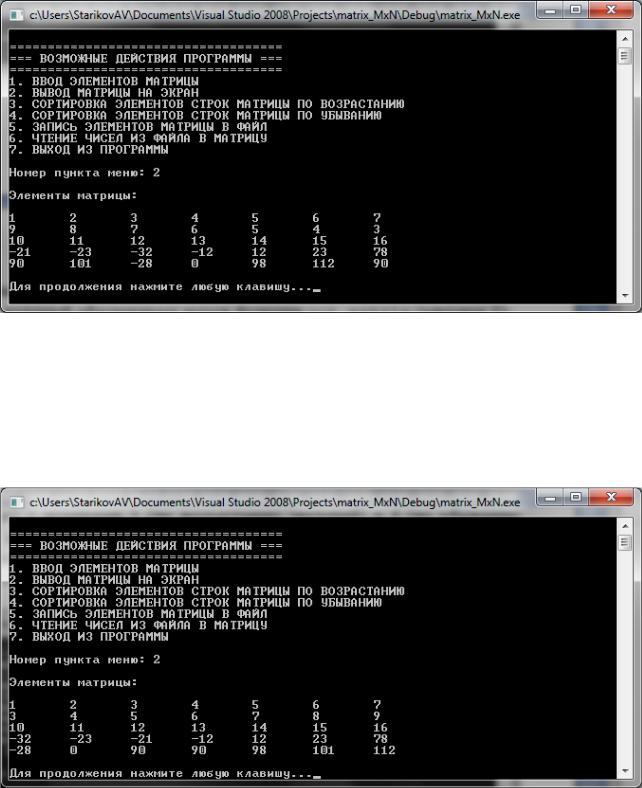 Для сортировки введенных значений в строках массива используются пункты меню с номерами 3 (по возрастанию значений) и 4 (по убыванию значений), которые обеспечивают вызовы функций sort_1 и sort_2 соответственно. После выполнения сортировки выбирается пункт меню с номером 2 для просмотра результатов сортировки (рисунки 4 и 5).