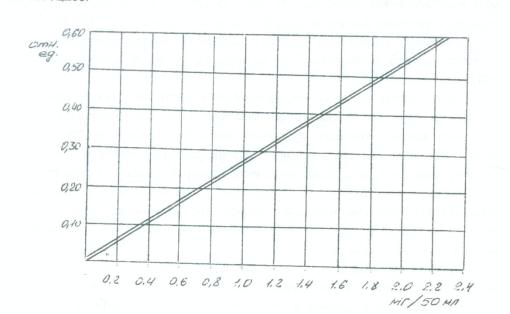 Повторить измерение и из полученных отсчетов взять среднее арифметическое. Определить концентрацию вытяжки по калибровочному графику (рис. 2): найти на оси ординат соответствующую оптическую плотность, провести от нее горизонтальную линию и от точки пересечения с калибровочным графиком опустить перпендикуляр на ось абсцисс.