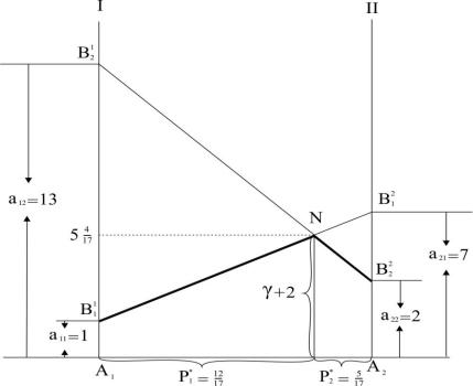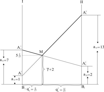B2 проведем оси I и II. На перпендикулярных осях I и II откладываем выигрыши при стратегиях B1 и B2 .