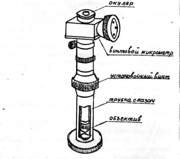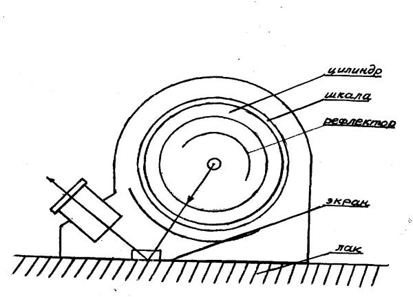 В корпусе прибора имеется цилиндр из молочно-белого оргстекла, на котором наклеена шкала в виде негативной фотопленки с десятью строками цифр, освещаемых изнутри двумя лампочками. Движение света направляется рефлектором. Снизу цилиндр закрыт экраном с прорезью, через которую на контролируемую поверхность проецируются светящиеся строки цифр. Светящиеся фигуры (цифры) наблюдают в окуляр. На одной оси с цилиндром снаружи корпуса имеется лимб с делениями от 1 до 10. Их порядок соответствует порядку появления строк на барабане:1 – самая крупная строка (высота цифр 14 мм); 10 – самая мелкая строка (высота цифр 0,5 мм).