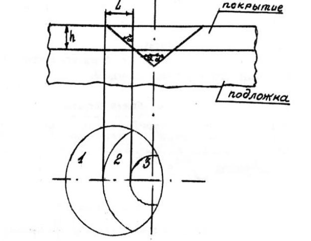 Рис. 4 Схема проекции лунки, высверленной в покрытии: 1 – поверхность покрытия; 2 – срез покрытия; 3 – подложка