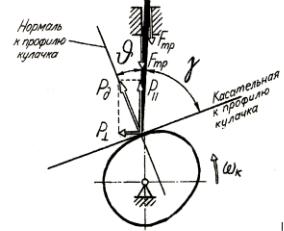 Силу давления кулачка Pд на ведомое звено можно представить в виде суммы сил РП, параллельной направлению движения ведомого звена, и Р - перпендикулярной направлению движения ведомого звена. Сила PП движет ведомое звено, а сила Р толкает его в сторону, вызывая перекос в направляющих и возбуждая силы трения в опорах Pmp, направленные против PП. При больших углах давления (малых углах передачи движения) со-