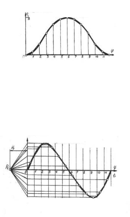Отрезок ℓ=ОО делим на 12 равных частей. На плане положений механизма определяем расстояния В0В1; В0В2; В0В3 и т.д., откладываем их в одноименных точках 1; 2; 3 и т.д. Масштабный коэффициент S для оси перемещения диаграммы S = f (t) принимаем равный двум масштабным коэффициентам плана положений механизма S = 2 l .