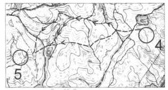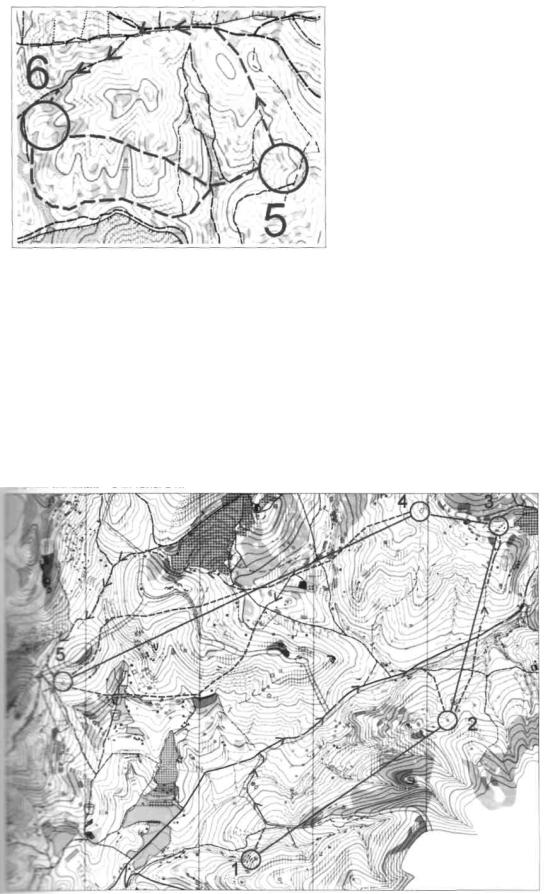 Ситуация на этапе 4 – 5 (рис. 5) близка к той, что встретилась на этапе 1 – 2. Южный обходной вариант самый длинный (1400 метров), удобный для бега (дорога, пологие открытые долины), с наименьшим набором высоты (сумма подъемов – 65 метров). В итоге – 2050 м эквивалентной длины или около 8 мин 15 с бега (при длине этапа по прямой – 1050 м).