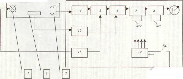 1 – излучатель; 2 – фотоприемник; 3 – термодатчик; 4, 10 – усилители; 5 – логарифмирующее устройство; 6 – перемножитель; 7 – корректор нуля; 8 – пиковый детектор; 9 – показывающий прибор; 11 – генератор импульсов; 12 – стабилизатор напряжения; Sa1 – кнопка включения питания; Sa2 – кнопка коррекции; Sa3 – переключатель режима работы