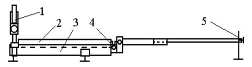 Рис. 5.1 Схема длиннобазового рычажного прогибомера: 1 – индикатор для измерения прогиба; 2 – вращающийся рычаг; 3 – неподвижная часть (швеллер); 4 – ось вращения; 5 – измерительная часть