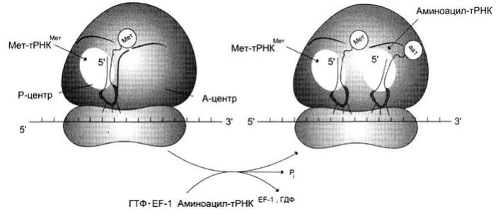 аа1-тРНКaa1 взаимодействует с рибосомой в виде тройного комплекса, состоящего из фактора элонгации ЕF-1, аа1-тРНКaa1 и ГТФ. Антикодон аа-тРНКaa1 комплементарен и антипараллелен кодону мРНК в А- центре. Связывание аа1-тРНКaa1 происходит за счёт энергии гидролиза ГТФ до ГДФ и Рi.