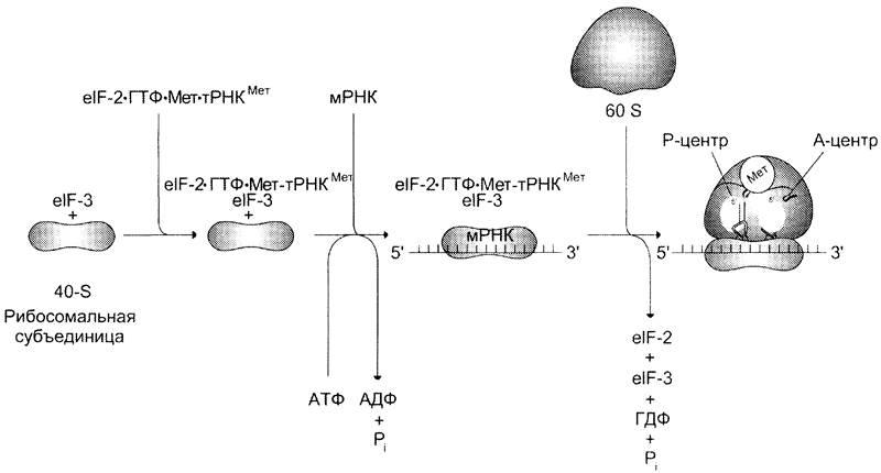 Мет-тРНКМет + elF-2 + ГТФ) присоединяется к 5'-концу мРНК с помощью неск. инициир. факторов, и малая субъединица начинает скользить по мРНК до тех пор, пока антикодон Мет-тРНКМет не свяжется с инициирующим кодоном AUG.